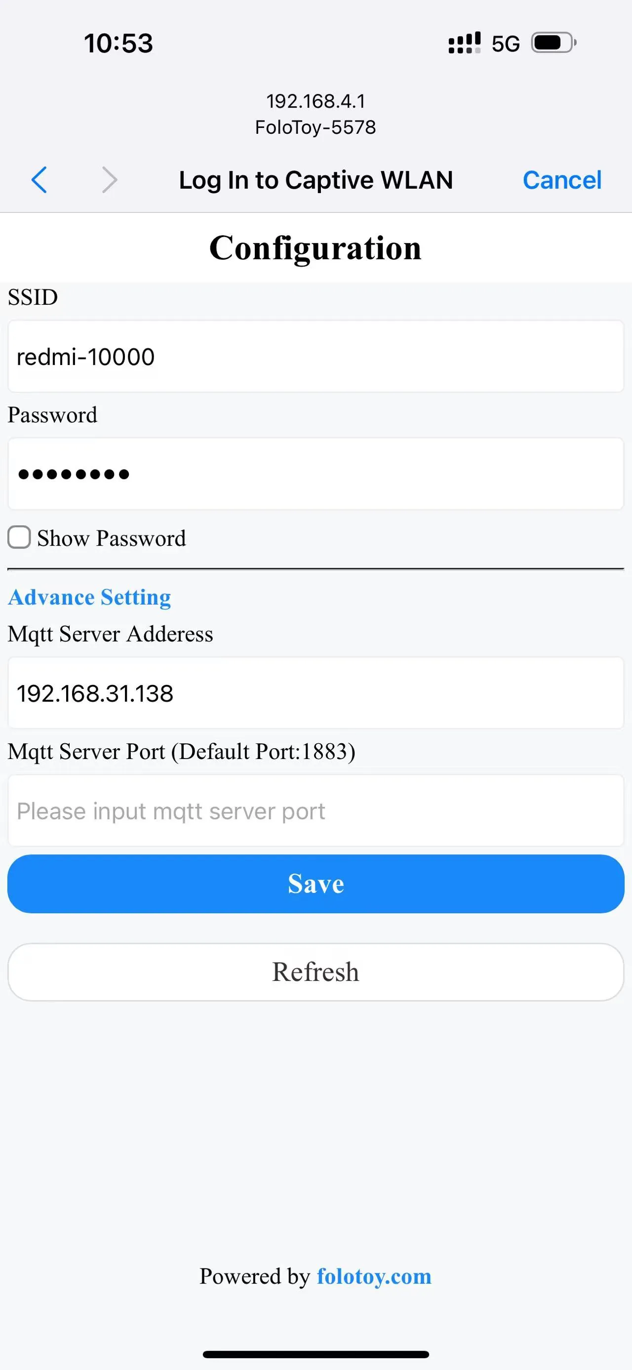 Accendi il tuo telefono o computer e seleziona la rete wireless "FoloToy-xxxx". Dopo un momento, il telefono o il computer aprirà automaticamente una pagina di configurazione in cui è possibile impostare a quale rete WiFi (SSID e password) connettersi, nonché l'indirizzo del server (come 192.168.x.x) e il numero di porta (mantenere il 1883 predefinito).