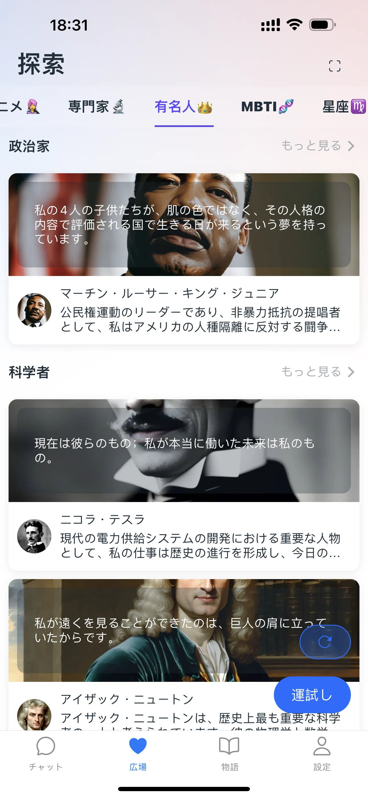 さまざまな分野の最も偉大な思考家との意味のある対話の可能性を想像してみてください。Cyber Bubble は、知識人、専門家、ビジョナリーをモデルにした AI エンティティを提供することで、この可能性を実現しています。哲学、技術、その他の分野に関心があるかどうか、私たちのプラットフォームは知的な豊かさのためのユニークなスペースを提供しています。