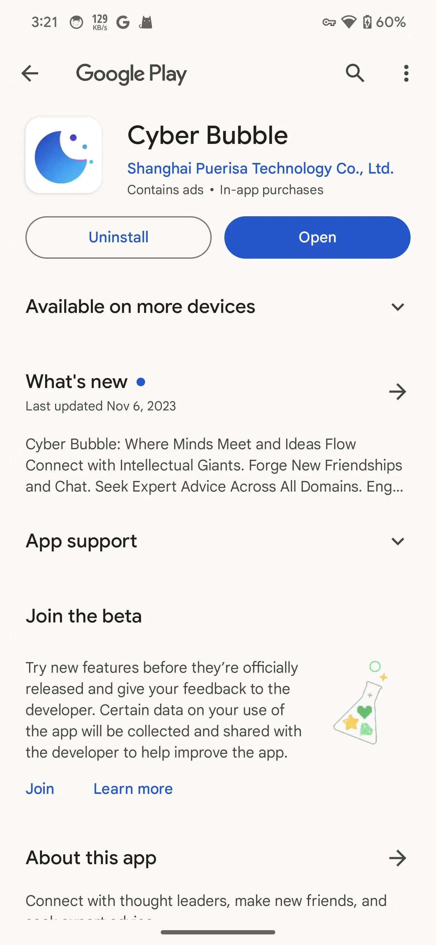 我们非常激动地宣布,革命性的AI深度对话平台 Cyber Bubble 现已在 Google Play 上线!今天就加入我们,开始您的意义非凡的数字对话之旅。